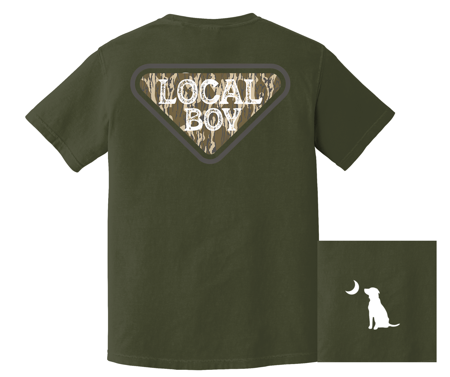 The Local Boy Moss Shield Tee features a bold back camo shield graphic with classic Local Boy branding, paired with a clean front chest logo. The deep olive tone and camouflage detail make this an easy everyday tee for outdoor living.