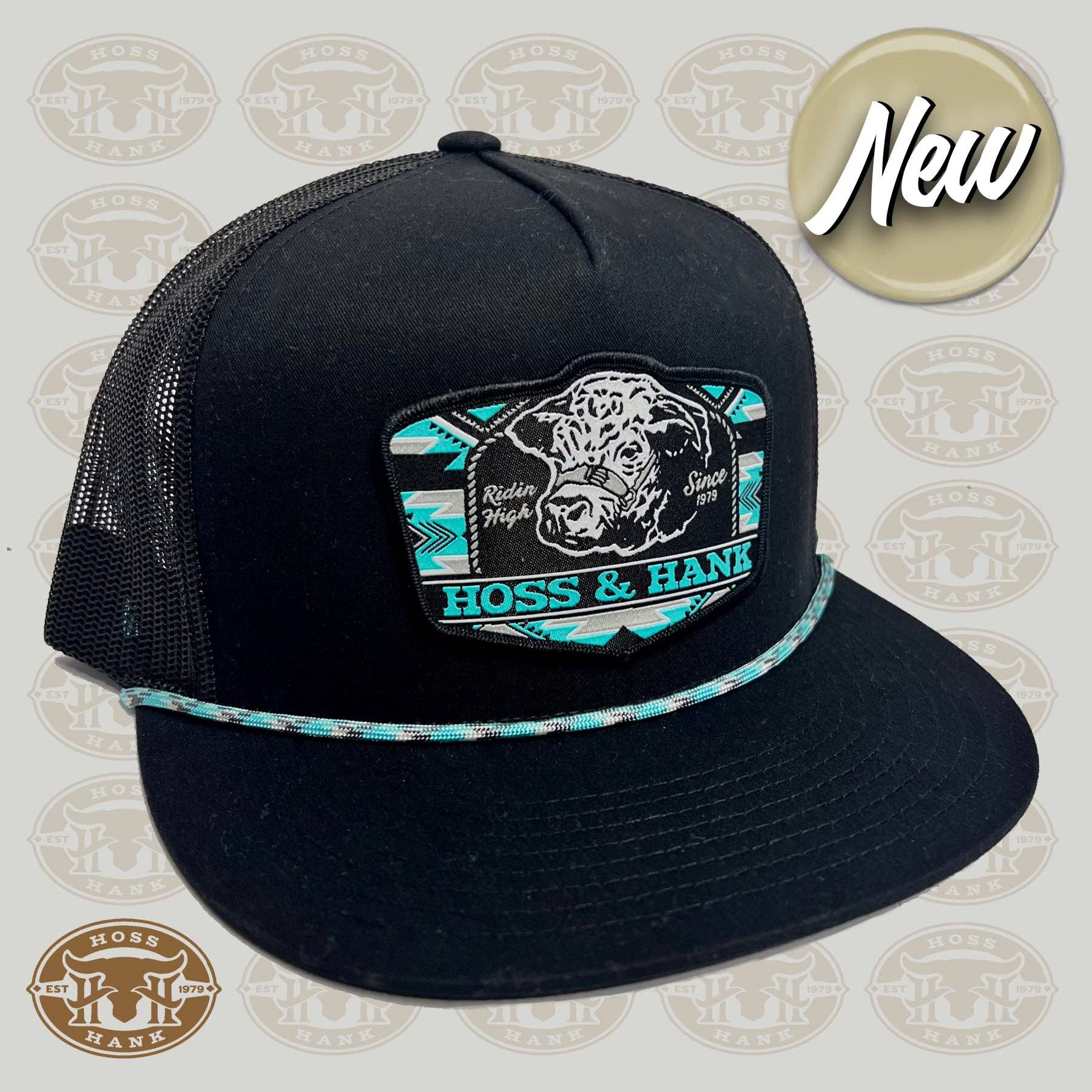 This tall boy SnapBack is designed in all black with a touch of turquoise with a stylish rope detail and features the Hoss&Hank outlawfitters logo. Expertly crafted and designed with a stylish rope detail. Perfect for everyday wear or as a unique addition to your hat collection.