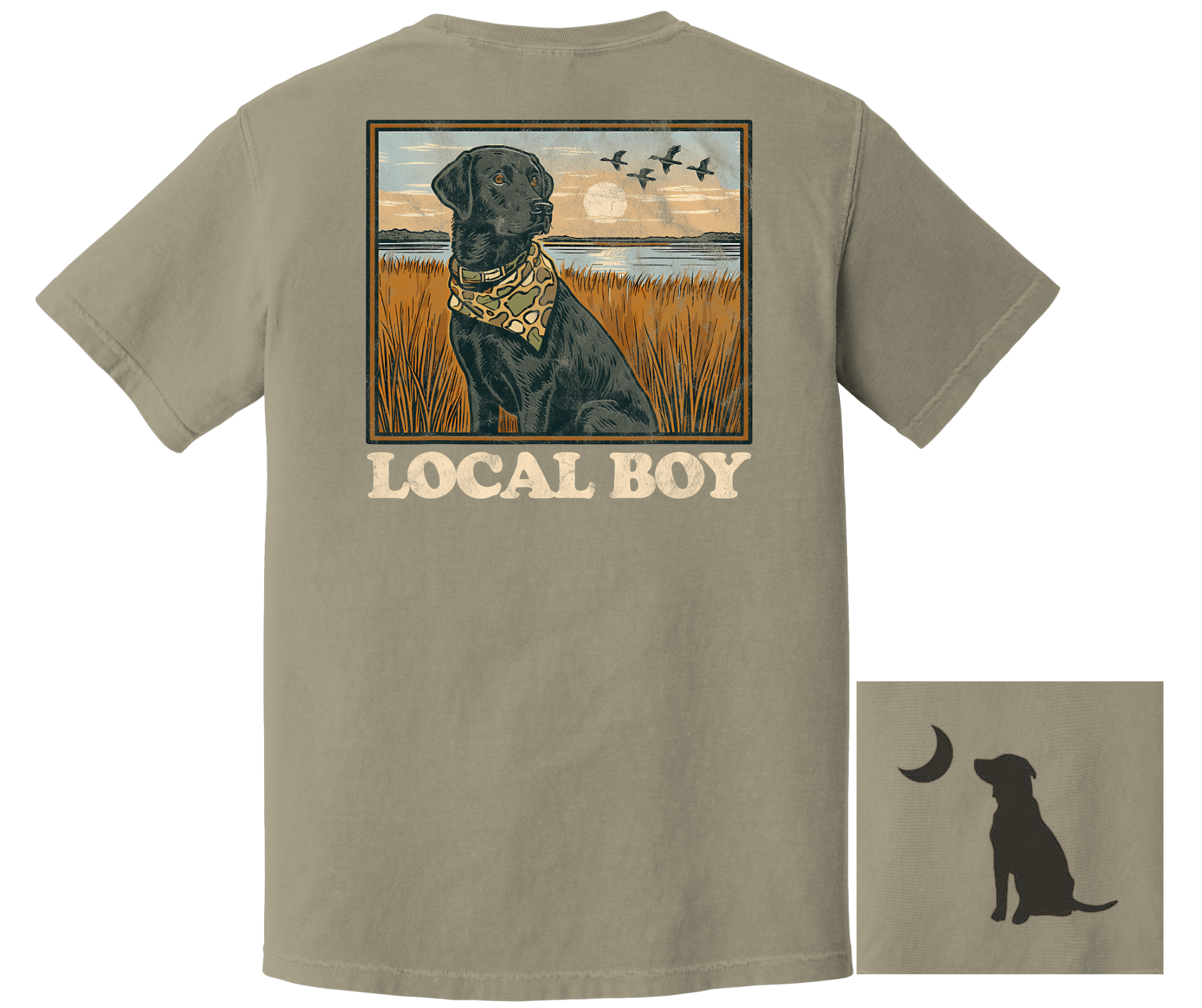 Our Southern Boy Outdoors Charm Black Lab Graphic Tee | Local Boy Southern Shirt features a vintage-style black lab sitting in a coastal marsh scene, finished with earthy tones and classic outdoor charm. The back graphic makes a statement, while the subtle front chest detail keeps it clean and timeless.